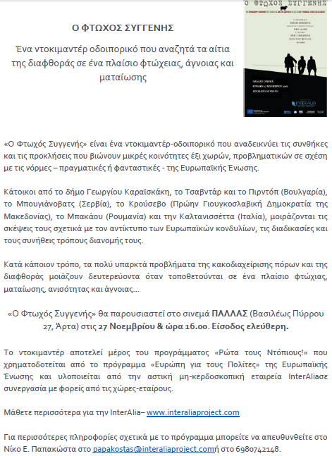 Άρτα: «Ο Φτωχός συγγενής» του Ηπειρώτη Νίκου Ε. Παπακώστα, ένα οδοιπορικό ντοκιμαντέρ, στην Ελλάδα, την Ιταλία και τα Βαλκάνια, που αναζητά τα αίτια της διαφθοράς, σε ένα πλαίσιο φτώχειας, άγνοιας και ματαίωσης, θα παρουσιαστεί στο κινηματογράφο ΠΑΛΛΑΣ, στις 27 Νοεμβρίου, ώρα 16:00, με είσοδος ελεύθερη