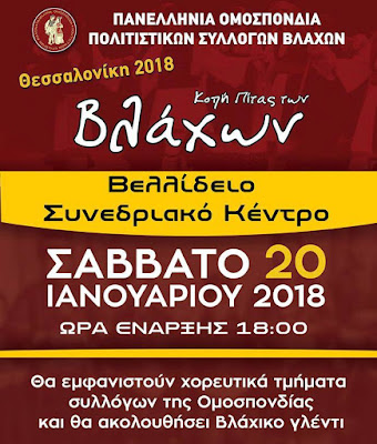 Η Πανελλήνια Ομοσπονδία Πολιτιστικών Συλλόγων Βλάχων κόβει την Πίτας της στο Συνεδριακό Κέντρο Ι. Βελλίδης, το Σάββατο 20 Ιανουαρίου, ώρα 18:00 στη Θεσσαλονίκη