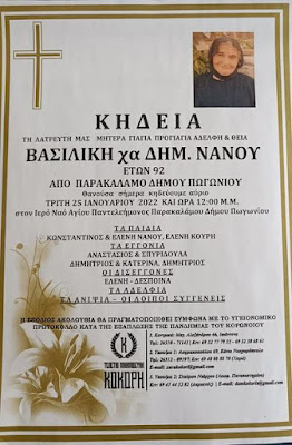 «Έφυγε» από την ζωή τη Δευτέρα 24 Ιανουαρίου, σε ηλικία 92 ετών, η συγχωριανή Νάνου Χρ. Βασιλική, χήρα Δημητρίου.